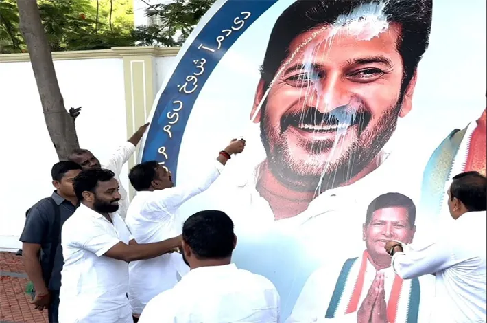 సీఎం రేవంత్ రెడ్డి ఫ్లెక్సీ కి క్షీరాభిషేకం చేసిన సన్నబియ్యం లబ్ధిదారులు