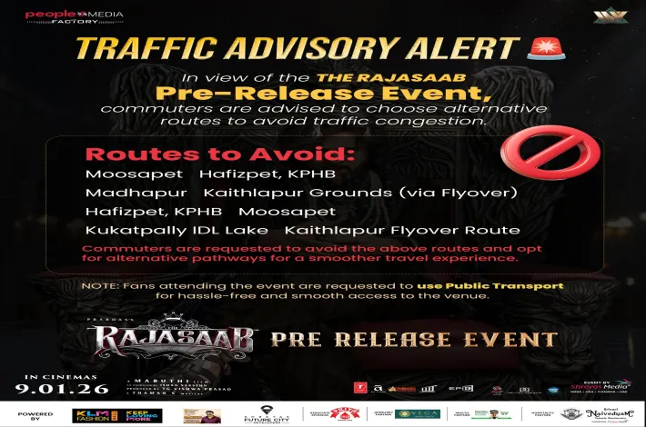 హైదరాబాద్: కూకట్పల్లిలోని ఖైత్లాపూర్ గ్రౌండ్స్లో జరగనున్న ప్రభాస్ 'రాజా సాబ్' సినిమా ప్రీ-రిలీజ్(Raja Saab Movie Pre Release Event) కార్యక్రమం దృష్ట్యా, వాహనాల రాకపోకలు సజావుగా సాగేలా, ప్రజల భద్రతను నిర్ధారించడానికి హైదరాబాద్ ట్రాఫిక్ పోలీసులు ట్రాఫిక్ సలహాను జారీ చేశారు. సాయంత్రం 5:00 గంటల నుండి కూకట్పల్లి-ఖైత్లాపూర్ గ్రౌండ్స్ ప్రాంతానికి ప్రయాణికులు రాకుండా ఉండాలని సూచించారు. ఎందుకంటే పెద్ద సంఖ్యలో జనం గుమిగూడే అవకాశం ఉన్నందున భారీ ట్రాఫిక్ రద్దీ, మళ్లింపులు జరిగే అవకాశం ఉందని తెలిపారు. విధుల్లో ఉన్న ట్రాఫిక్ పోలీసు సిబ్బంది జారీ చేసిన సూచనలను పాటించాలని కోరారు. ప్రజలు తమ ప్రయాణాలను అందుకు అనుగుణంగా ప్లాన్ చేసుకోవాలని, అందరికీ సురక్షితమైన, ఇబ్బందులు లేని ప్రయాణాన్ని నిర్ధారించడానికి సహకరించాలని ట్రాఫిక్ పోలీసులు విజ్ఞప్తి చేశారు.