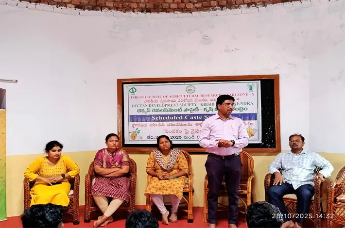జహీరాబాద్, అక్టోబర్ 30 :డి.డి.ఎస్ - కృషి విజ్ఞాన కేంద్రం ఆధ్వర్యంలో అగ్రికల్చర్ టెక్నాలజీ అప్లికేషన్ రీసెర్చ్ ఇన్స్టిట్యూట్ సహకారంతో మూడు రోజుల శాస్త్రీయ పద్ధతిలో తేనెటీగల పెంపకంపై నైపుణ్య శిక్షణ కార్యక్రమం నిర్వహించడం జరిగింది. ఇందులో భాగంగా మొదటిరోజు సీనియర్ శాస్త్రవేత్త డాక్టర్ సి.వరప్రసాద్ మాట్లాడుతూ రైతులు అన్ని పద్ధతులు పాటిం చినప్పటికీ కాయ నాణ్యత, దిగుబడి, పువ్వు రాలడం అనేది ఎక్కువగా మాకు వస్తున్న సమాచారమని, దీనికి శాస్త్రవేత్తలు సమస్యను గుర్తించి తేనెటీగల పెట్టెలను రకరకాల పంటల్లో పెట్టి వాటి ఉత్పత్తిని గమనించడం జరిగిందన్నారు.