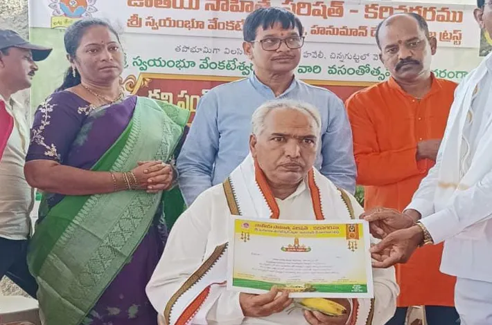 కామారెడ్డి (విజయక్రాంతి): కామారెడ్డి జిల్లా దోమకొండ మండల కేంద్రానికి చెందిన ప్రభుత్వ పాఠశాల తెలుగు పండిత్ ఉపాధ్యాయుడు వెంకటేశ్వర శర్మను శనివారం కరీంనగర్ లో జాతీయ సాహిత్య పరిషత్ ఆధ్వర్యంలో ఘనంగా సన్మానించారు. ఈ కార్యక్రమంలో పలువురు వేద పండితులు పరిషత్ అభిమానులు పాల్గొన్నారు.