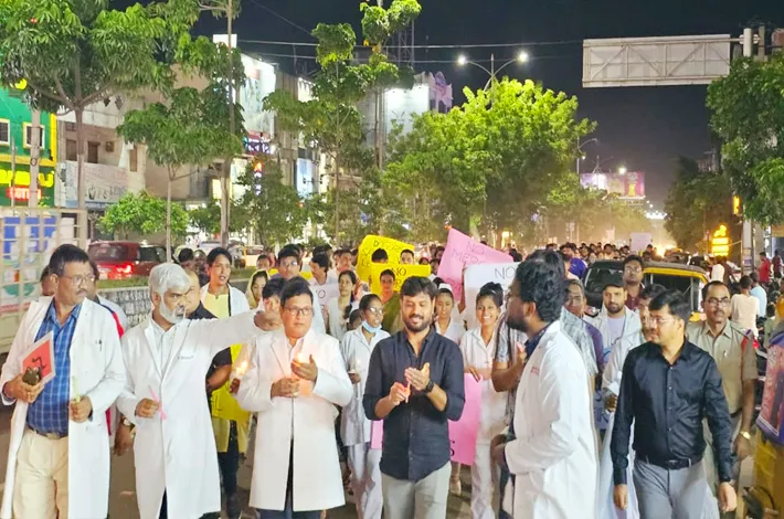 టీటీడీజీఏ అసోసియేషన్ కరీంనగర్ శాఖ అధ్యక్షులు డా. హరి క్రిష్ణారెడ్డి ఆధ్వర్యంలో ఐఎంఏ అసోసియేషన్ నాయకులు, ప్రతిమ, చల్మెడ మెడికల్ కాలేజీలతోపాటు కరీంనగర్ కు చెందిన డాక్టర్లు సోమవారం సాయంత్రం కొవ్వొత్తుల ర్యాలీ నిర్వహించారు. కరీంనగర్ లోని మంచిర్యాల చౌరస్తా నుండి కోర్టు చౌరస్తా వరకు నిర్వహించిన ఈ కొవ్వొత్తుల ర్యాలీలో దోషులను కఠినంగా శిక్షించాలంటూ డిమాండ్ చేశారు.