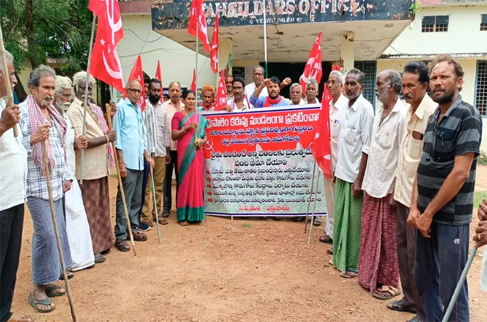 ఎర్రుపాలెం అక్టోబర్ 27 ( విజయక్రాంతి) : ఎర్రుపాలెం మండలం తాసిల్దార్ కార్యాలయం ముందు రైతుల సమస్యలపై రైతు సంఘం జిల్లా నాయకులు గొల్లపూడి పెద్ద కోటేశ్వరరావు అధ్యక్షతన నిర్వహించిన ధర్నాలో సిపిఎం పార్టీ జిల్లా కమిటీ సభ్యుల దివ్వెల వీరయ్య,మండల కార్యదర్శి మద్దాల ప్రభాకరరావు మాట్లాడుతూ సిపిఎం ఎర్రుపాలెం పార్టీ మండల కమిటీ ఆధ్వర్యంలో గత పది రోజులుగా వివిధ గ్రామాలలో క్షేత్రస్థాయిలో వివిధ పంటలు పరిశీలన, రైతు సమస్యలను సర్వే చేయటం జరిగిందని ఈ సమస్యలను వినతి పత్రం మండల అధికారికి అందించడం జరిగిందన్నారు.