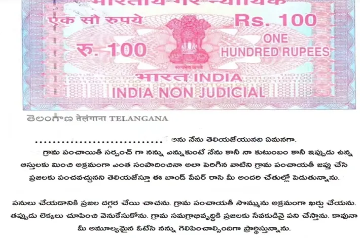 నంగునూరు: సర్పంచ్ ఎన్నికల బరిలో దిగుతున్న అభ్యర్థులకు సిద్దిపేట జిల్లా నంగూనూరు గ్రామ ప్రజలు వినూత్నమైన సవాలు విసిరారు. ఎన్నికల హామీలు, మ్యానిఫెస్టోలకు భిన్నంగా, ఏకంగా రూ. 100 విలువైన నాన్-జుడిషియల్ బాండ్ పేపర్పై సంతకం చేయాలని గ్రామస్తులు డిమాండ్ చేస్తున్నారు. పదవిలోకి వచ్చిన తర్వాత అక్రమాస్తులు కూడబెట్టుకుంటే, వాటిని గ్రామ పంచాయతీకి అప్పగించాలంటూ పలు అంశాలను బాండ్ పేపర్లో పొందుపర్చారు. ఈ వినూత్న పద్ధతి నంగూనూరులో ఎన్నికల వాతావరణాన్ని పూర్తిగా మార్చేసింది. గెలిచే అభ్యర్థి ప్రజల నమ్మకాన్ని, ఈ బాండ్పై ఇచ్చిన హామీని ఎంతవరకు నిలబెట్టుకుంటారనేది ఆసక్తికరంగా మారింది.