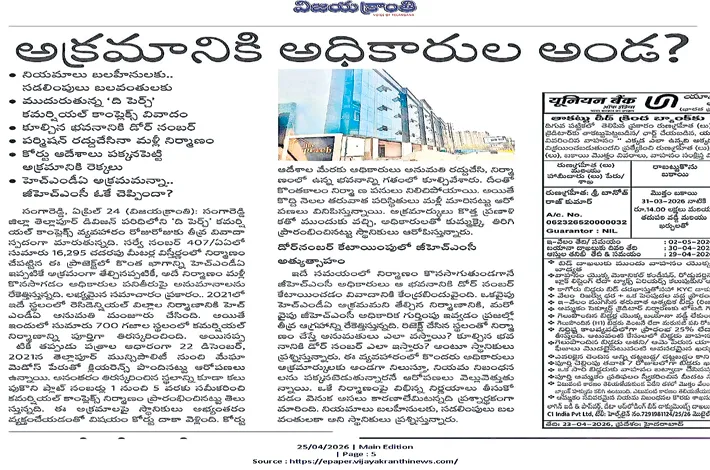 సంగారెడ్డి, ఏప్రిల్ 27(విజయక్రాంతి): తెల్లాపూర్ పరిధిలో కొనసాగుతున్న ‘ది పెర్చ్’ కమర్షియల్ కాంప్లెక్స్ అక్రమ నిర్మాణ వివాదంపై చివరకు జీహెచ్ఎంసీ అధికారులు స్పందించారు. స్థానికుల నుంచి తీవ్ర ఆరోపణలు వెల్లువెత్తుతున్న నేపథ్యంలో అధికారుల్లో ఎట్టకేలకు కదలిక వచ్చింది. ఈ విషయంపై జీహెచ్ఎంసీ ఏసీపీ పవన్ను సంప్రదించగా, ‘నేను కొత్తగా బాధ్యతలు స్వీకరించాను. ఈ ప్రాజెక్ట్పై పూర్తి సమాచారం లేదు. సంబంధిత వివరాల కోసం డీ సీని సంప్రదించాలి’ అని తెలిపారు.అనంత రం డీసీ జ్యోతి రెడ్డి స్పందిస్తూ కీలక వ్యా ఖ్యలు చేశారు. ఈ నిర్మాణానికి కేటాయించిన డోర్ నెంబర్ను రద్దు చేస్తాం. మొత్తం వ్యవహారంపై సమగ్ర విచారణ జరుపుతాం.