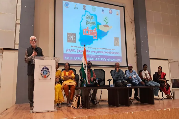 నల్గొండ టౌన్, ఫిబ్రవరి 9: విద్యార్థులు వైజ్ఞానిక దృక్పథాన్ని అలవర్చుకోవాలి ఎం జి యూవీసీ ఖాజా అల్తాఫ్ హుస్సేన్. అన్నారు ప్రకృతి, వైజ్ఞానికత, రాజ్యాంగాన్ని పరిరక్షించుకోవాలనే నినాదంతో, విజ్ఞాన దర్శిని సంస్థ ఆధ్వర్యంలో గత నెల రోజులుగా సాగుతున్న ప్రకృతి విజ్ఞాన యాత్ర సోమవారం మహాత్మా గాంధీ విశ్వవిద్యాలయానికి చేరుకుంది. ఎం జి యు సెమినార్ హాల్లో నిర్వహించిన కార్యక్రమంలో ఆయన పాల్గొని మాట్లాడారు.