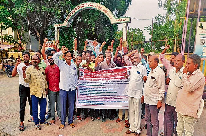 నిర్మల్, సెప్టెంబర్ 22(విజయక్రాంతి): నిర్మల్ జిల్లాలో ఆర్టీసీకి అద్దె బస్సులు నడుపుతున్న యజమానులు డ్రైవర్లకు వేతనాలు పె ంచాలని డ్రైవర్డు డిమాండ్ చేశారు. లేదంటే సోమవారం నుంచి అద్దె బస్సులు నడుపబోమని స్పష్టం చేశారు. ఆదివారం నిర్మల్ బస్ డిపో ఎదుట ఏఐటీయూసీ నాయకులతో కలిసి ధర్నా చేశారు. కనీస వేతనాల చట్టం ప్రకారం డ్రైవర్లకు రూ.18వేలు చెల్లించాలని, క్లీనర్లకు రూ.12వేలు ఇవ్వాలని కోరారు.