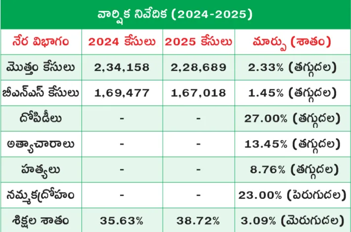 రాష్ర్టంలో నేరాల నియంత్రణకు తీసుకున్న పటిష్ట చర్యలు సత్ఫలితాలను ఇచ్చా యని డీజీపీ తెలిపారు. 2024లో రాష్ర్టవ్యాప్తంగా మొత్తం 2,34,158 కేసులు నమోదు కాగా, 2025 నాటికి ఆ సంఖ్య 2,28,689కి తగ్గింది. అంటే ఓవరాల్గా 2.33 శాతం నేరాలు తగ్గాయి.