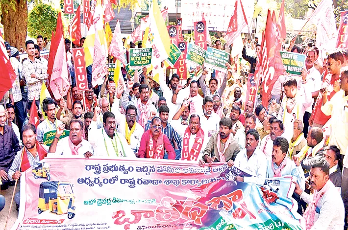 ఖైరతాబాద్ డిసెంబర్ 9 (విజయక్రాంతి) : ఎన్నికల సమయంలో ఆటో డ్రైవర్లకు ఇచ్చిన హామీలు అమలుచేయక కాంగ్రెస్ ప్రభుత్వం దగా చేస్తుందని తెలంగాణ రాష్ట్ర ఆటో డ్రైవర్స్ యూనియన్స్ జెఏసి నేతలు ఆరోపించారు. దీర్ఘకాలికంగా పెండింగ్ లో ఉన్న ఆటో డ్రైవర్ల సమస్యలు పరిష్కరించాలని డిమాండ్ చేస్తూ తెలంగాణ రాష్ట్ర ఆటో డ్రైవర్స్ యూనియన్స్ జెఏసి హైదరాబాద్, ఖైరతాబాద్, ఆర్.టి.ఏ కమిషనర్ కార్యాలయం ఎదుట మంగళవారం భారీ ధర్నా నిర్వహించింది.