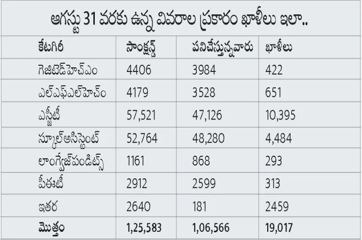 మొత్తం సాంక్షన్డ్ టీచర్ పోస్టులు 1,25,583 ఉంటే, అందులో ప్రస్తుతం పనిచేస్తు న్న ఉపాధ్యాయులు 1,06,566 మంది ఉండగా, 19,017 ఖాళీపోస్టులు ఉన్నట్లు గుర్తించారు. ఇందులో ప్రధానంగా గెజిటెడ్ హెడ్మాస్టర్ ఖాళీలు 422, ఎల్ఎఫ్ఎల్ హెచ్ం 651, ఎస్జీటీ పోస్టులు 10,395 ఉండగా, స్కూల్ అసిస్టెంట్ పోస్టులు 4484, లాంగ్వేజ్ పండిట్ పోస్టులు 293, పీఈటీ పోస్టులు 313, వొకేషనల్, ఆర్ట్ అండ్ క్రాఫ్ట్, మ్యూజిక్ ఇతరత్ర పోస్టులు 2459 ఖాళీలున్నాయి. నాన్ టీచింగ్ పోస్టు ల్లో పనిచేస్తున్న వారు 2,686 మంది ఉన్నారు.