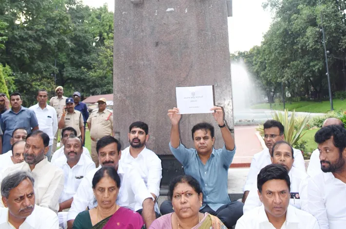 హైదరాబాద్ సిటీబ్యూరో, ఆగస్టు 2 (విజయక్రాంతి): రాష్ట్ర ప్రభుత్వం ప్రకటించిన జాబ్ క్యాలండర్ నిజమైనదే అయితే, ఆ క్యాలెండర్లో ఏడాదికి ఇస్తామన్న 2 లక్షల ఉద్యోగాలు ఏమయ్యా యని మాజీ మంత్రి, బీఆర్ఎస్ వర్కింగ్ ప్రెసిడెంట్ కేటీఆర్ నిలదీశారు. అశోక్నగర్లో విద్యార్థులు ఈ ప్రభుత్వం ఒక్క ఉద్యోగం ఇచ్చినట్టుగా చెప్పినా మేమంతా రాజీనామా చేస్తామని సవాల్ చేశారు. జాబ్ క్యాలండర్ పేరు తో ప్రభుత్వం ఒక్క ఉద్యోగాన్ని కూడా ప్రకటించకపోవడంపై గన్పార్కు వద్ద బీఆర్ఎస్ ఎమ్మెల్యేలు, ఎమ్మెల్సీలు శుక్రవారం నిరసనకు దిగారు. ఈ సంద ర్భంగా కేటీఆర్ మాట్లాడుతూ, స్వయంగా రాహుల్ గాంధీ అశోక్నగర్కు వచ్చి మొదటి ఏడాదిలోనే 2 లక్షల ఉద్యోగాలు ఇస్తామని నిరుద్యోగులకు ఇచ్చిన హామీ ఏమైందని ప్రశ్నించారు.