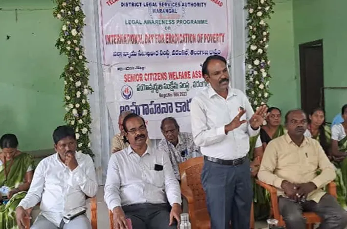 హనుమకొండ టౌన్,(విజయక్రాంతి): అంతర్జాతీయ పేదరిక నిర్మూలన దినోత్సవం సందర్భంగా వరంగల్ జిల్లా న్యాయసేవాధికార సంస్థ, కార్యదర్శి యం.సాయి కుమార్ ఆదేశాల మేరకు వరంగల్ రంగశాయిపేట లోని మహిళా స్వశక్తి భవన్ లో పేదరిక నిర్మూలన అంశంపై సీనియర్ సిటిజన్స్ వెల్ఫేర్ అసోసియేషన్ అధ్యక్షులు కె.మల్లారెడ్డి అధ్యక్షతన నిర్వహించిన కార్యక్రమంలో ముఖ్య అతిథిగా ఛీఫ్ లీగల్ ఏయిడ్ కౌన్సిల్ ఆర్.సురేష్ పాల్గొని మాట్లాడుతూ... పేదరిక నిర్మూలనలో మహిళలు ప్రత్యేక చొరవ చూపాలని తెలిపారు. నిరక్షరాస్యత, నైపుణ్యాలను సద్వినియోగం చేసుకోక పోవడం వల్లనే పేదరికం పెరుగుతుంది అని అన్నారు. మహిళలు ఆర్థికంగా బలపడడానికి స్వయం ఉపాధి పథకాలను అనుసరించాలని సూచించారు. మహిళలు ఆర్థికంగా బలపడి మహిళా సాధికారతకు కృషి చేయాలని తెలిపారు.