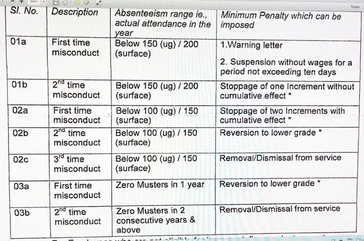 - సంవత్సరంలో భూగర్భ గని కార్మికులకు 100 రోజులు, ఉపరితల కార్మికులకు 150 రోజుల కంటే తక్కువ ఉంటే మొదటిసారి తప్పు చేస్తే, రెండు ఇంక్రిమెంట్లు శాశ్వతం గా నిలిపివేస్తారు. ఇది భవిష్యత్తు ఇంక్రిమెంట్లపై కూడా ప్రభావం చూపుతుంది. రెండోసారి తప్పు చేస్తే, ప్రస్తుత గ్రేడ్ నుంచి కింది స్థాయి గ్రేడ్కు మారుస్తారు. మూడోసారి తప్పు చేస్తే, ఉద్యోగం నుంచి శాశ్వ తంగా తొలగిస్తారు.