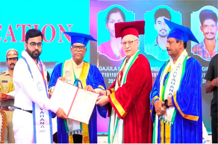 బిచ్కుంద, నవంబర్ 7 (విజయక్రాంతి) : కామారెడ్డి జిల్లా జుక్కల్ నియోజకవర్గం మద్నూర్ మండల కేంద్రానికి చెందిన చౌడేకర్ యోగేష్ కరీంనగర్ శాతవాహన విశ్వవిద్యాలయంలో శుక్రవారం జరిగిన స్నాతకోత్సవంలో గవర్నర్ జిష్ణుదేవ్ వర్మ చేతుల మీదుగా బంగారు పథకం అందుకున్నారు.