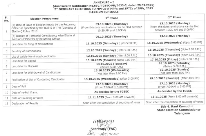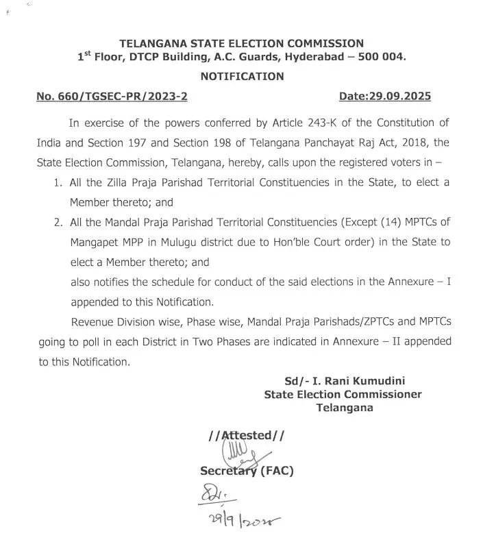 హైదరాబాద్: తెలంగాణలో స్థానిక సంస్థల ఎన్నికలకు నోటిఫికేషన్(ZPTC MPTC Local Body Election Schedule) గురువారం విడుదల అయింది. దీంతో మొదటి విడత జడ్పీటీసీ, ఎంపీటీసీ ఎన్నికల నామినేషన్లు స్వీకరణ ప్రారంభం అయింది. రాష్ట్ర వ్యాప్తంగా 31 జిల్లాల్లో ఎంపీటీసీ, జెడ్పీటీసీ కార్యాలయాల్లో ఈనెల 11 వరకు అభ్యర్థుల నుంచి నామినేషన్లు స్వీకరించనున్నారు. 53 రెవెన్యూ డివిజన్లలో తొలివిడతలో 292 జడ్పీటీసీ, 2,963 ఎంపీటీసీ స్థానాలకు ఎన్నికలు నిర్వహిస్తారు. రెండు విడతల్లో ఎంపీటీసీ, జడ్పీటీసీ ఎన్నికలు జరగనున్నాయి.
